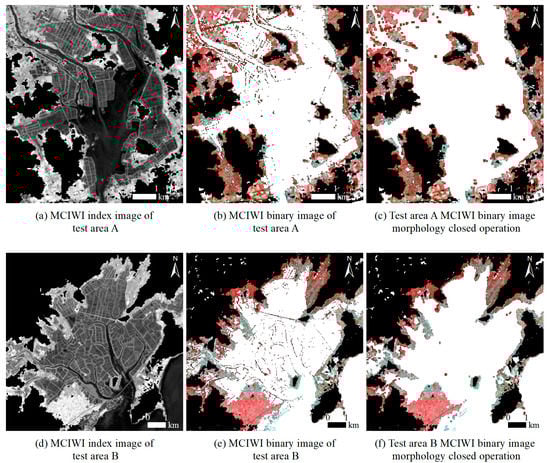 Otsu’s method is an automatic threshold segmentation algorithm based on the first-order statistical characteristics of the gray histogram. This method is not affected by image brightness and contrast, has fast operation speed and high storage efficiency, and is widely used in the research of image threshold segmentation [45,46]. We used Otsu’s method to obtain the optimal threshold of water and non-water segmentation in the test area. The MCIWI results (Figure 6a,d) were binarized to determine the water–land boundary (Figure 6b,e). We performed a morphological closure operation to remove the unconnected cavities in the aquaculture water, and obtained the water coverage area (Figure 6c,f).