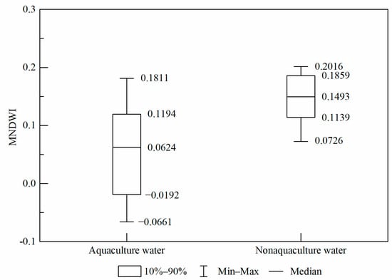 In this study, we used the MNDWI to enhance the low-reflection information of aquaculture ponds, and to improve the clarity of the grid characteristics of aquaculture ponds. We selected 200 random points from aquaculture and non-aquaculture water bodies in the study area, and extracted and counted the MNDWI values of random points (Figure 7). Under the action of the MNDWI, most aquaculture-related water bodies could be distinguished from non-aquaculture-related water bodies, but within the MNDWI interval of 0.1139–0.1194, it is still challenging to distinguish.
