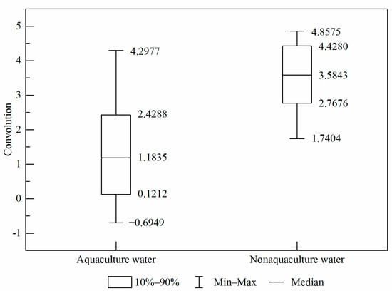 To completely distinguish between aquaculture and non-aquaculture water bodies, we used spatial convolution to further increase the spectral differences between these two types of water bodies. We used a 5 × 5 convolution kernel (Formula (3)) to carry out a spatial convolution operation of low-pass filtering on the MNDWI exponential image. As with the previous verification, we selected 400 random points for the two types of water bodies from the convolution operation image for numerical statistical analysis (Figure 8). The convolution values of 90% of the aquaculture water bodies were between 0.1212 and 2.4288, and the convolution values of 90% non-aquaculture water bodies were between 2.7676 and 4.4280, effectively separating the two types of water bodies.