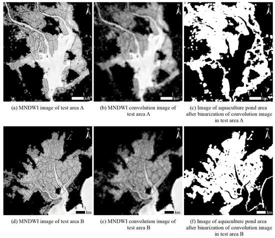As shown in Figure 9, after MNDWI processing, the detailed features of the two types of water were highlighted (Figure 9a,d). The MNDWI operation after the convolutional operation further enhanced the low-frequency information of the aquaculture pond, and weakened the internal details of the water, while also obtaining a clear water boundary (Figure 9b,e). The image after convolution was binarized, and the non-aquaculture water area was segmented by the threshold, leaving only the aquaculture water area (the best threshold in the test area was 2.0) (Figure 9c,f).