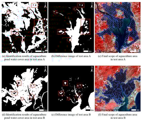 In response to our first research question (i.e., to discover by examination and comparison), the missing holes in the aquaculture water bodies were not attached to the non-aquaculture water bodies. We resolved this issue by turning these holes into entities, and then separating and adding them back to the aquaculture water body areas. Using image spatial difference technology, we could obtain the different images of the water body covering area (Figure 6c,f) and the aquaculture water body covering area (Figure 9c,f) to identify the missing aquaculture water body entities (the rectangular boxes in Figure 10b,e). To address the problem of redundant water bodies, such as tributaries and drainage ditches connected to aquaculture water bodies, we combined visual interpretation and elimination with Google high-resolution images.