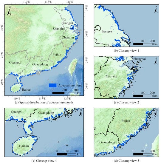 We used these methods to identify and extract aquaculture ponds in the coastal areas of southeast China and the main island of Hainan, and obtained a regional distribution map of aquaculture ponds in the coastal areas of southeast China (Figure 11). As shown in Figure 11, the aquaculture ponds in the study area are densely distributed, but their spatial distribution is uneven. The aquaculture ponds in Jiangsu and Guangdong are more distributed and larger in area, and most of the aquaculture areas have a certain scale. In Fujian, Guangxi, and Zhejiang, there are more aquaculture ponds and large-scale concentrated aquaculture zones, but the number is slightly lower than that of Jiangsu and Guangdong. The aquaculture areas in Hainan are small and evenly distributed. Furthermore, the aquaculture areas in the northeast of Hainan have a high degree of agglomeration and scale, whereas the aquaculture ponds in other directions are small in scale. Aquaculture ponds in Shanghai are small in area, are concentrated in distribution and small in scale, and belong to low-density aquaculture areas.