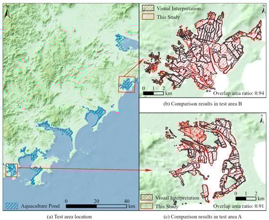 To further test the effectiveness of the extraction method, we added a typical regional overlay comparison test process. Additionally, to calculate the proportion of overlapping areas, based on Google’s high-resolution images, we visually interpreted the aquaculture pond areas in test area A (Figure 12c) and test area B (Figure 12b), and conducted a spatial overlay comparison between the visual interpretation results and the automatic extraction results (Figure 12). Test area A is located in Zhangzhou Zhao’an Bay Gongkou port, and test area B is located in Zhangzhou Qianhu Bay. The results showed that the overlap ratio of the automatic extraction results and the visual interpretation results was more than 90% in the two test areas, among which, the overlap ratio of Zhao’an Bay Gongkou port was 91%, and the overlap ratio of Qianhu Bay was 94%. These results further verified the accuracy of the extraction method.
