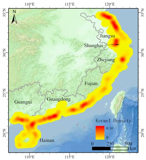Kernel density analysis of the aquaculture pond region in coastal waters of the southeast region.