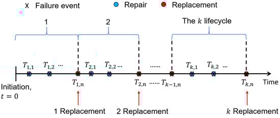 Consider a simple corrective maintenance strategy: replacing the water main with a new one at the -th breaks; then, the question becomes: what is the optimal ? This idea is illustrated in Figure 1. In terms of the concept of net present value, the total cost of the water main due to maintenance and replacement in a sufficient long planning horizon can be written as: