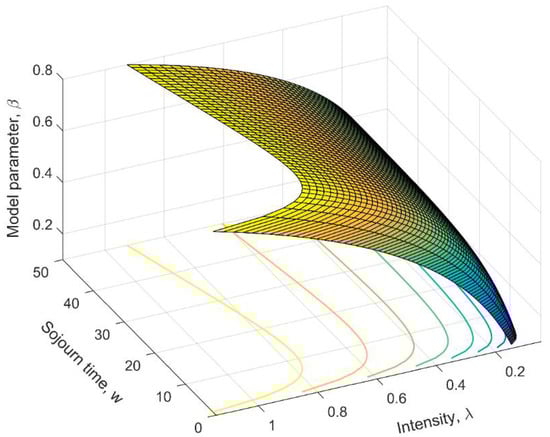 Three-dimensional plot of against model parameter and the sojourn time given , , , and .