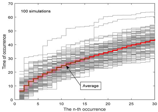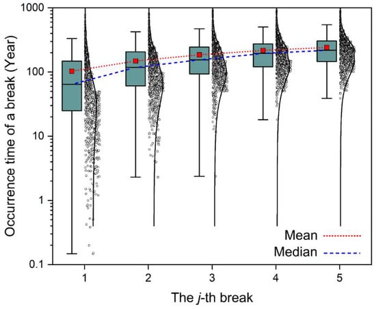 On average, the first two breaks occur within , i.e., , . A total of eight breaks can be expected within . It should be noted that here, does not have a unit, meaning that it can be a year, month, minute, second, or others, depending on the data used for investigation. Another observation is that the simulated break events tend to occur either one shortly after another, or none within a relatively long period of time. This matches observations from engineering experience.