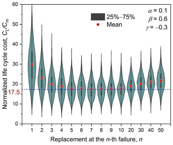 Figure 5 shows the distributions and the means of the normalized total life cycle costs (in net present value) against the value for the reference example. In the figure, the mean was averaged from 10,000 simulations; each simulation had 1000 cycles. The means, medians, and COVs for the in Figure 5 are summarized in Table 2. As shown, all the distributions are more or less symmetric. Applying K-S tests shows that most of them can be considered normal distributions. The mean is about 30 at , but decreases to about 17.5 as increases to 7; after that, increases to about 22 for . These results suggest that the optimal value is 7, meaning a water main pipe should be replaced by a new one rather than repaired every 7 breaks. The difference of the mean reaches 12.5, i.e., against .