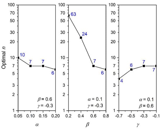 The second observation is that the effect of is much larger than those by and . As drops from 0.8 to 0.2, the optimal correspondingly increases from 6 to 63, which is over an order of magnitude of difference. For and , the variation ranges are within 6 to 10 for decreasing from 0.20 to 0.05, and 4 to 7 for increasing from −7 to −0.1. This reveals that is the most influential parameter in .