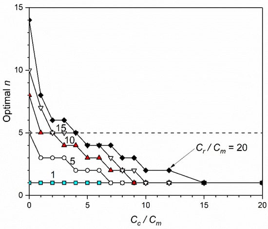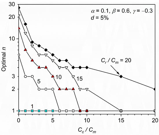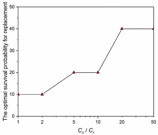 Equation (5) indicates that the optimal mainly depends on the cost ratios of and . If , then obviously the main should be replaced at each break. The breaking event becomes a renewal process. This also applies to cases with severe consequence, i.e., . If , then the optimal solution for will depend on the ratio of .