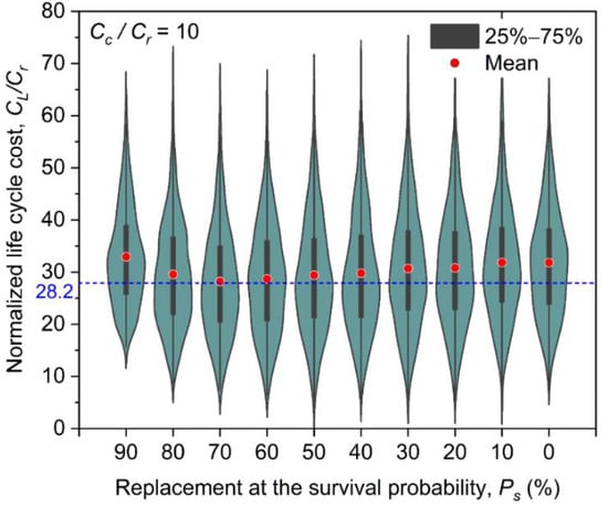 Another observation from Figure 5 is that the coefficient of variation (COV) of exhibits a decreasing trend with increasing value. The COV is as large as 32% for the case, and continuously drops to about 22% for the case. It is worth mentioning here that this study takes the mean as the target for life cycle cost optimization. For those taking both mean and COV of as the targets, a different optimal value can be resulted.