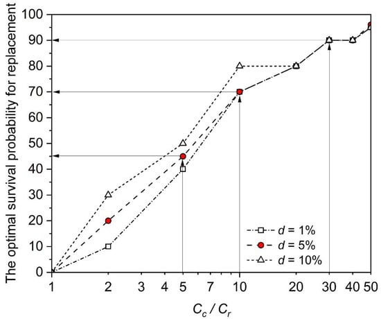 Figure 9 shows the influences of on the optimal survival probability for replacement with consideration of discounted rates at = 1%, 5%, and 10%. As increases, i.e., the consequence due to water main breaks becomes higher, the main should be replaced earlier, i.e., at larger . For larger discounting rate with a fixed , a higher optimal for replacement is reached. This is because a larger results in less costs than the net present value, which, in turn, gives higher optimal . Interestingly, it is found that the effect of diminishes at a larger value, for example, for exceeding 20, the optimal appears to be independent on . This can be explained by the fact that for large , the optimal is also high, i.e., over 80%. The water main will be replaced ‘shortly’ after being put into service. Due to this short time duration, the effect of is small.