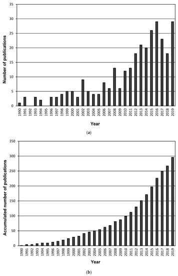 The evolution through time of the annual scientific production in the sources of Scopus and the total number of accumulated documents are graphed in Figure 1. Three different stages were distinguished. The first one covers the 1990–2009 period. Until 2009, the annual number of publications was maintained at a regular production of around 5 papers per year, and only 2008 contributed more than 10 papers. The second stage ranged from 2010 to 2016 and followed a linear increase in the annual production, starting at 12 documents and attaining 29 documents. Finally, the production was reduced in 2017 and 2018 (23 and 18 documents, respectively) to recover the value attained in 2016 again in 2019. Nonetheless, when the accumulated number of publications was analyzed, the corresponding evolution could be adjusted to a parabolic growth, and a quadratic regression model was applied to the data. The obtained equation was y = 0.475x2 + 56.1x + 22.2, where y represents the number of accumulated documents and x the year (starting with 1 for the year 1990). The result exhibited a good fit, with an R2 value of 0.988.