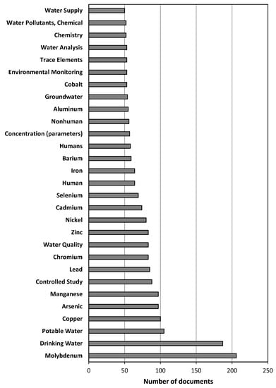 The list of the 29 most often used keywords (the only ones that were mentioned at least 50 times) is shown in Figure 2. Obviously, “molybdenum” was the most frequent keyword, as it was selected in 206 articles. The second position in the ranking corresponded to the other expression introduced in the Article Title, Abstract, Keywords field of the search engine database, “drinking water”, which appeared 187 times, followed by “potable water”, appearing 105 times. Indeed, these figures indicated that only 69.6% of all the identified documents used “molybdenum” as a keyword, while this percentage was reduced to 63.2% for “drinking water”. After a further look into the terms listed, the identification of several other metallic and metalloid elements in the first positions in the ranking must be highlighted: “copper” (100 times), “arsenic” (97 times), “manganese” (9 times), “lead” (85 times), “chromium” (83 times), “zinc” (80 times), “cadmium” (74 times), “selenium” (69 times), “iron” (64 times), “barium” (59 times), “aluminum” (55 times) and “cobalt” (53 times). Although other bibliometric analyses have identified the relevance of the toxicity interactions (synergistic and antagonistic effects) between metals [], in the case of molybdenum, there is a lack of terms related to toxicological tests in the terms compiled in Table 2, and the presence of all these elements as frequent keywords should be explained by two alternative causes. On the one hand, the evaluation of the presence and the distribution of molybdenum in drinking water, water bodies or other samples of environmental interest implied a more complete water sampling and characterization, which included the assessment of the concentrations of all these elements in addition to molybdenum [,,]. On the other hand, as mentioned in the previous section regarding the most cited documents, molybdenum can be useful for potabilization treatments and the removal of other elements from water. Finally, terms directly related to possible technologies for molybdenum removal from water or wastewater treatment were not frequently selected as keywords.