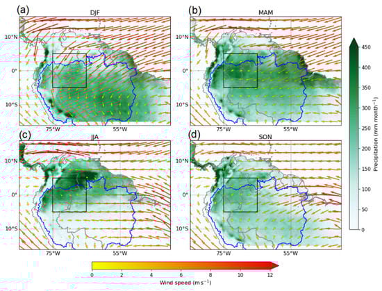 950–850 hPa ERA5 wind vectors (arrows) and long-term mean CHIRPS precipitation for austral (a) summer (b) autumn (c) winter (d) spring. The black box indicates the SAM V-Index region over the western Amazon (5° S–5° N, 65°–75° W), an area where the seasonal reversal of the cross-equatorial flow over South America is observed, according to Wang et al. [24]. The blue line indicates the limits of the Amazon basin.
