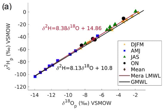 The relationship of δ18Op and δ2Hp at the Mera site is closely aligned to the Global Meteoric Water Line (GMWL). Their linear relationship (LMWL) is δ2Hp = 8.38δ18Op +14.86 (n = 30), showing an ~5‰ higher deuterium intercept (Figure 3a). A closer inspection of the figure shows the intra-annual seasonality in δ18Op, where austral summer (DJFM; min −8.5‰, max −1.6‰, mean −4.9‰) and winter (JAS; min −8.0‰, max −2.0‰, mean −4.9‰) indicate the most 18O-enriched values, whereas the austral autumn (AMJ; min −14.0‰, max −6.5‰, mean −11.2‰) present the most 18O-depleted. In the case of austral spring (ON; min −8.4‰, max −3.4‰, mean −6.4‰), the values plot close to the mean average, although the value for October 2020 was particularly high (−3.40‰ δ18Op). As the results show that δ2Hp and δ18Op are well correlated, the subsequent discussion primarily focuses on the δ18Op. The Mera LWWL (δ2Hp = 8.38δ18Op +14.86) agrees with the recently calculated Jumandy (δ2Hp = 8.33δ18Op +14.65) and Ikiam (δ2Hp = 8.30δ18Op +14.64) LMWLs encompassing a similar but shorter period from April 2019 to February 2020 [6]. The sites are comparable to the Mera site due to their similar location at the western Amazon with ~65 km distance from each other, supporting our findings.