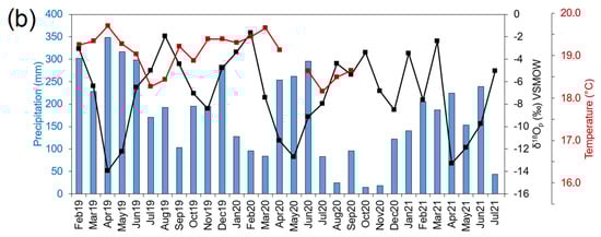 The monitoring campaign at the Mera site, Central Ecuador, from February 2019 to July 2021 (n = 30) showing (a) the meteoric relationship for 18O and 2H in precipitation. The mean value for δ18Op is −6.98‰ and for δ2Hp is −43.62‰ (red diamond); (b) the comparison between the local amount of rainfall (blue bars) with δ18Op (black line) and temperature (red line).