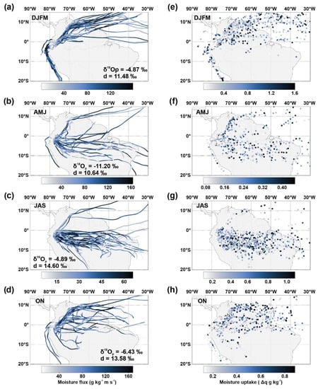 Seasonal moisture flux and uptake for the Mera site, Central Ecuador, calculated from 2014 to 2019 at 1500 m following the method of Sodemann et al. [51] using the PySplit package [49]. (a,e) December–March; (b,f) April–June; (c,g) July–September; (d,h) October–November. The seasonal δ18Op and d-excess values are indicated at the bottom of each map.