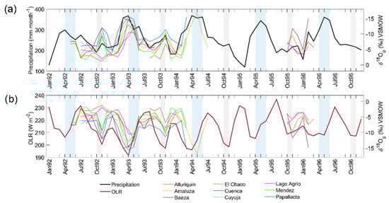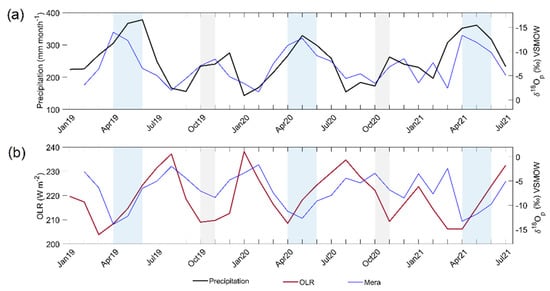 The monitoring of δ18Op in the Mera site, central Ecuador, from February 2019 to July 2021 and comparison with (a) amount of precipitation and (b) Outgoing Longwave Radiation (OLR) at the northwestern V-Index region. The blue and gray stripes highlight the bimodal peak in precipitation (zenithal rain) during AMJ and ON. The right y-axis is reversed in (a) for direct comparison.