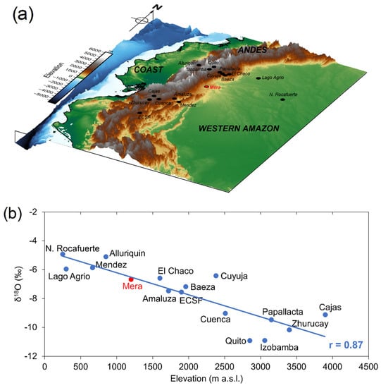 The altitude effect for δ18Op at the Andean and western Amazonian stations in Ecuador. (a) 3-D perspective map of Ecuador indicating the location of the stations with δ18Op values at northern and southern latitudes (black dots). The Mera site in central Ecuador links these domains due to its location in an unrepresented area in the Amazon. (b) Mean annual δ18Op values for the stations displayed in (a) presenting an altitude gradient of −0.15‰ per 100 m.
