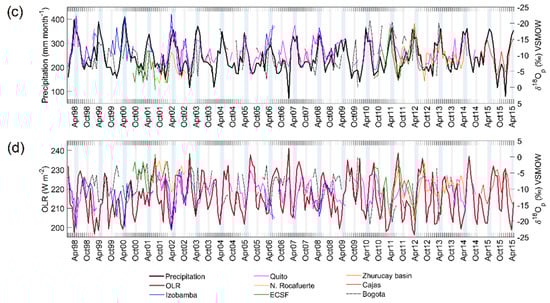 Remarkably, the Mera δ18Op time-series follows the general pattern of regional precipitation at the V-Index region. Figure 5a reveals the marked decrease of δ18Op during austral autumn and spring (AMJ and ON), coinciding with the bimodal zenithal rain peak in the region (low OLR values in Figure 5b). On the contrary, higher δ18Op values are visualized during the less-wetter periods in summer and winter (DJFM and JAS). A similar case was found with the OLR values for the same period (r = 0.47; Table 1). Although the synchrony is lower than the ERA5 precipitation (due to the coarser resolution), the general trend is preserved (Figure 5b). The OLR values decline during AMJ and ON (<220 W m−2), indicating deep convective activity during these months over the equator, after the equinoxes, known as zenithal rain [31,64].