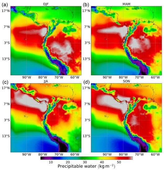 Precipitable water from a WRF simulation for 18Z (1 p.m. Ecuador continental time) with a horizontal resolution of 50 km over northern South America for austral: (a) summer, (b) autumn, (c) winter, (d) spring.
