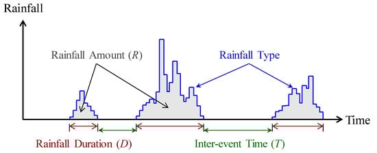 In this study, a stochastic rainfall generator was developed to produce a continuous rainfall time series with a high temporal resolution of 10 min. A continuous rainfall time series contains data for alternate wet and dry periods. The wet period indicates a rainfall event, and the dry period is called the inter-event time. A rainfall event can be characterized by rainfall duration, quantity, and type. Therefore, a continuous rainfall time series contains data related to four parameters: total rainfall quantity (R), rainfall duration (D), rainfall type, and rainfall inter-event time (T) (Figure 1).