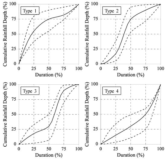 Profile-based models typically use Huff rainfall curves as the basis for defining the temporal distribution of rainfall events. These curves are empirical and dimensionless, probabilistic representations of cumulative hyetographs. The temporal rainfall patterns were classified into four types (Type 1 to Type 4) according to the time when the peak intensity occurred (i.e., in the first, second, third, or fourth quarter of rainfall duration). Figure 2 presents the temporal patterns, median (solid line), and 10% and 90% cumulative probabilities (lower and upper dashed lines, respectively) of the four types of Huff curves. The cumulative rainfall depth and cumulative rainfall duration were standardized by the total rainfall depth and total rainfall duration, respectively, and are presented in dimensionless form within the interval from 0% to 100%.
