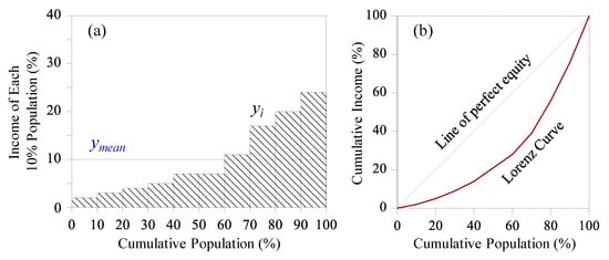 Example of the derivation of a Lorenz curve: (a) income of each 10% of the population arranged in a nondecreasing order and (b) comparison of the Lorenz curve and the line of perfect equity.