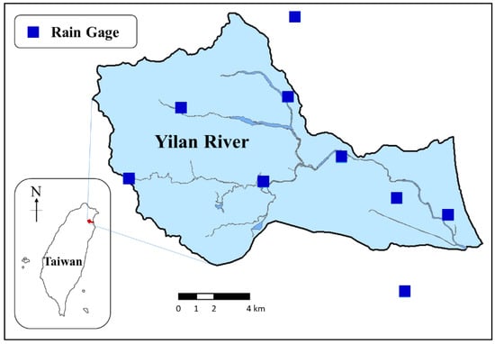 In this study, 10 min rainfall data from 2012 to 2018 were collected for the Yilan River Basin in Taiwan. The Yilan River’s watershed is located in northeastern Taiwan (Figure 6), where the typical climate is humid and rainy. Nine rain gauges collect 10 min rainfall data for the Yilan River Basin. As displayed in Figure 6, seven of these rain gauges are located inside the basin, whereas two are located outside the basin.