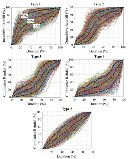 A threshold value of the Schutz index () was determined to identify Type 5 rainfall events. No a priori criterion can be used to set the threshold value; however, Bonta and Shahalam [64] suggested using the data of more than 120 storms to obtain stable Huff curves. The present study assumed that the number of Type 5 rainfall events was not greater than the numbers of Type 1 to Type 4 rainfall events. This assumption is rational because the number of rainfall events with a uniform distribution (Type 5) is usually less than those with a nonuniform distribution (Types 1 to 4). Therefore, a grid search method was used for under the condition of increasing the number of Type 5 rainfall events; however, the number of Type 5 rainfall events was constrained by the minimum number of Type 1 to Type 4 rainfall events. Consequently, the number of Type 5 rainfall events could not exceed the minimum number of Type 1 to Type 4 rainfall events. Table 2 lists the threshold values of for the summer and winter seasons as well as the numbers and percentages of Type 1 to Type 5 rainfall events. The threshold values for the summer and winter seasons were 0.29 and 0.30, respectively. By using the derived thresholds and the process described in the previous section (Figure 5), the identified rainfall events were categorized into different types. Figure 7 shows the classification of rainfall types for the summer season by using modified Huff rainfall curves. The bold black curves connecting squares, circles, and triangles indicate the 10%, 50%, and 90% percentiles of the rainfall categories, respectively. The colored curves represent the observed rainfall distributions. The rainfall classification curves obtained for the winter season were analogous to those obtained for the summer season. In Figure 7, the Type 5 rainfall events exhibit the characteristic of uniform distribution, which is different from the characteristics of Type 1 to Type 4 rainfall events. The results displayed in Figure 7 support the rationale that the Type 5 category is essential for better representing a uniform rainfall distribution.