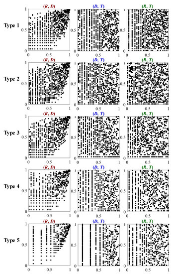 This study examined the correlation between each pair of the rainfall parameters by using normalized rank scatter plots [48]. The rainfall quantity, duration, and inter-event time were normalized between 0 and 1 and sorted in ascending order. These normalized and sorted data were then used to draw scatter plots. Figure 8 displays the normalized rank scatter plots for different pairs of rainfall parameters in the summer season. The rows in this figure indicate different rainfall types (Types 1 to 5), and the three columns denote three pairs of parameters. The patterns in the first column in Figure 8 indicate that the rainfall quantity and duration (R, D) are correlated, especially for large values. However, the patterns in the second and third columns suggest that no correlation exists between rainfall duration and inter-event time (D, T) and between rainfall quantity and inter-event time (R, T), respectively. The normalized rank scatter plots for the winter season are similar to those for the summer season and thus are not shown in this paper. Pearson correlation coefficients were calculated using the data in the rank-normalized plots to quantify the correlation between the rainfall parameters. The average correlation coefficients for (R, D) in the summer and winter seasons were 0.70 and 0.85, respectively. However, the correlation coefficients for (D, T) and (R, T) were close to 0. Therefore, the rainfall quantity and duration (R, D) were adopted to construct a bivariate copula for rainfall generation.