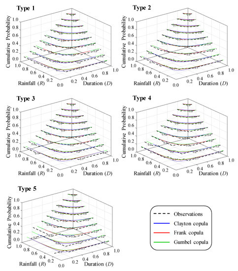 The next step involved determining which bivariate distribution function (from among the Frank, Clayton, and Gumbel copulas) was best suited for describing the correlation between the rainfall quantity and duration in the study area. Kendall’s tau () was calculated and used to determine the value of the three copulas adopted in this study (Table 1). The and values derived for the three copulas are listed in Table 3. After deriving the aforementioned values, the three copulas were used to model the correlation between rainfall quantity and rainfall duration. The cumulative probability functions of the three copulas for the summer season are illustrated in Figure 9. The blue, red, and green curves indicate the cumulative probability functions of the Clayton, Frank, and Gumbel copulas, respectively. The black dotted line represents the cumulative probability function of the empirical copula, which was constructed using the observed rainfall quantity and duration. The Clayton, Frank, Gumbel, and empirical copulas exhibited similar patterns to each other except for the Type 5 rainfall data under low cumulative probabilities. In general, the Clayton, Frank, and Gumbel copulas can suitably model the correlation between rainfall quantity and rainfall duration. The present study used the root mean square error (RMSE) for objectively determining the copula with the best fit to the empirical copula. Table 4 lists the RMSEs in probability (the vertical axis in Figure 9) for different copulas and rainfall types. The minimum RMSEs are highlighted in bold although some values are the same after being rounded off. The results indicate that the Frank copula was the most appropriate copula for modeling the correlation between the rainfall quantity and duration in the study area.