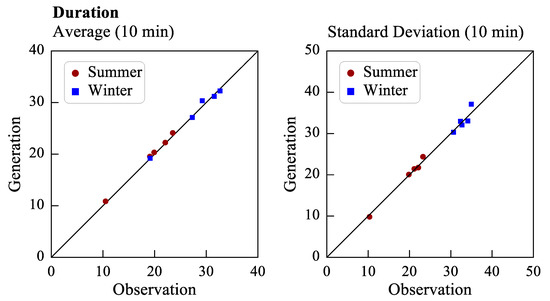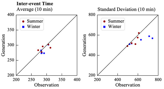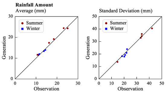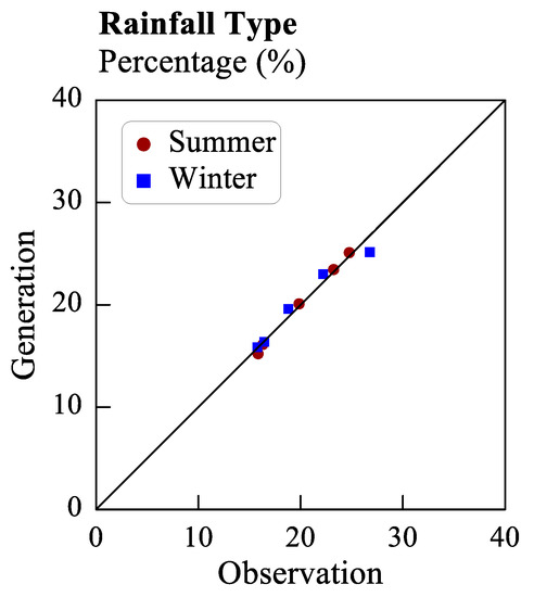 The statistics of four rainfall parameters were calculated to assess the performance of the proposed rainfall generator. Figure 10 presents the average rainfall quantity and the standard deviation of the rainfall quantity in the summer (red circle) and winter (blue square) seasons. The average and standard deviation were calculated with respect to rainfall type (Types 1 to 5); therefore, five points were obtained for each of the aforementioned parameters in each season. These points lie close to the 45° diagonal, which indicates that the average generated rainfall quantity and the standard deviation of the generated rainfall quantity are analogous to the corresponding observation data. As displayed in Figure 10, the average rainfall quantity and the standard deviation of the rainfall quantity were larger in the summer than in the winter season for all types of rainfall except for Type 5 rainfall (the smallest value represented by a red circle). Type 5 rainfall has a relatively uniform temporal distribution, and Type 5 rainfall events are usually short-duration events with low rainfall quantities. Therefore, in this study, the average rainfall quantity and standard deviation of the rainfall quantity were low for Type 5 rainfall. In general, the aforementioned parameters were larger for Type 2 and Type 3 rainfall than for the other types of rainfall.