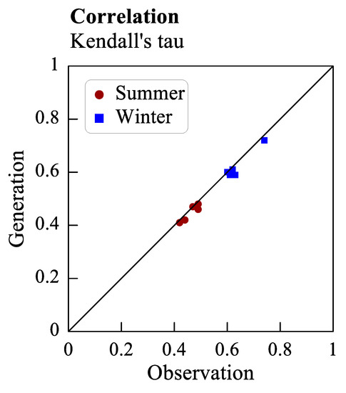 Figure 11 displays the average rainfall duration and the standard deviation of the rainfall duration, and the duration unit in this graph is 10 min. This figure reveals that the average rainfall durations were generally longer in the winter than in the summer season. The shortest average rainfall durations in the summer and winter seasons (the lowest red circle and blue square in the left part of Figure 11) were observed for Type 5 rainfall. Moreover, the standard deviations in winter were larger than those in summer. The aforementioned results correspond to the rainfall characteristics in the study area. The points plotted for the average rainfall duration and the standard deviation of the rainfall duration are close to the 45° diagonal, which indicates that the generated values are close to the observed values. The rainfall quantity and duration were generated using the copula method. Figure 12 illustrates the correlation between the rainfall quantity and the rainfall duration in terms of . Positive correlation coefficients were obtained between the aforementioned factors, which indicates that in general, the longer the rainfall duration, the higher the rainfall quantity. The higher correlation in winter than in summer suggests that more persistent rainfall was received for a longer duration in the winter rainfall events than in the summer rainfall events. The lower correlation in summer can be attributed to the various rainfall patterns observed during this season (i.e., frontal, convective, and typhoon rainfalls). Overall, the results displayed in Figure 10, Figure 11 and Figure 12 indicate that the selected copula can accurately reproduce the correlation between rainfall quantity and rainfall duration.