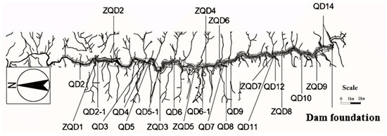 In order to study the hydrodynamic characteristics of different toppling deformations in the process of reservoir impoundment, penetration tests were performed in different types of toppling deformations: QD3, ZQD3, ZQD4, QD6-1, and QD14. The range of horizontal and vertical saturated zones under the action of the reservoir water was determined by measuring the permeability coefficient with time under different occurrences and different joint distribution characteristics of the four types of toppling deformations. The tests adopted a single-ring injection test method. The tests consisted of two types: a vertical penetration test and a horizontal penetration test. During the vertical penetration test, the depth of the water was kept at 10 m, with no more than 0.5 cm of fluctuation. During the horizontal penetration test, the initial water level, measurement time and drop height were recorded until the water level was 0.0 m or no longer falling.