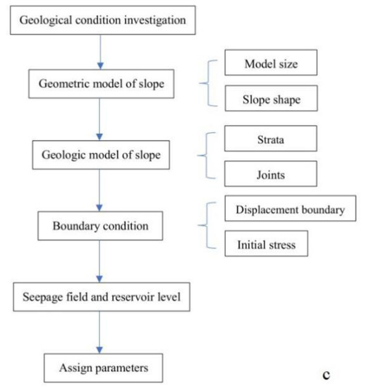 The reservoir water level outside the slope is set as a gradient every 10 m in the vertical direction; that is, 9 reservoir water levels are set at the elevations of 0 m, 10 m, 20 m, 30 m, 40 m, 50 m, 60 m, 70 m and 80 m to analyze the deformation characteristics of toppling slopes with different lithologic combination, and 10 m is the initial water level. The model height is 100 m, and the horizontal length is 170 m (Figure 2a). The constitutive model of rock mass adopts Mohr Coulomb material, and the yield criterion follows the Mohr Coulomb yield criterion. The bottom of the model was set as the velocity and displacement constraints in the vertical direction (Y direction) and the velocity and displacement constraints in the horizontal direction (X direction) of the left and right boundaries. The groundwater seepage mode is set as transient steady flow, and seepage is only formed between joints and layers. The pore water stress is determined by the elevation difference between the calculation point and the groundwater level. The model contains five strata (Figure 2b), where A is a toppling–collapse area, B1 is a toppling–loose area, B2 is a toppling–relaxation area, C is a toppling–creep area and D is intact bedrock. The physical and mechanical parameters used in the calculation are shown in Table 1 and Table 2. These parameters are obtained through physical tests and engineering analogy methods. The modeling steps are shown in Figure 2c.