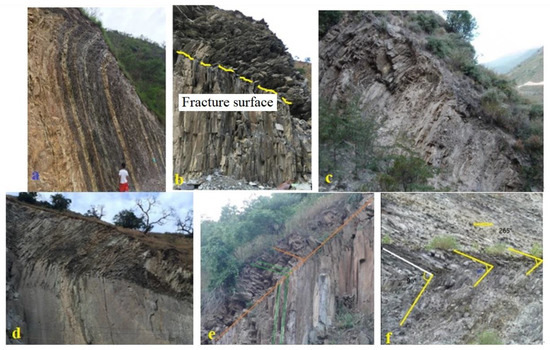 Due to the restriction of the cutting depths of the gullies, the toppling direction of the transverse slope points upstream or downstream, and the deformation degree is light. For example, on the old highway slope on the downstream side of the Wanba River, the bedrock orientation is N15°W, NE∠89°, the lithology is medium-thick-layered metamorphic quartz sandstone, the rock strata are stable and the upper part is toppling toward the surface. After the toppling, the orientation of the rock layer turned to N10°W, SW∠43°, and the rock formation was curved in a spine shape (Figure 5d) but not buckled, forming a toppling–loose structure (Figure 5e). However, the deformation is still dominated by toppling–bending and toppling–creep structures.