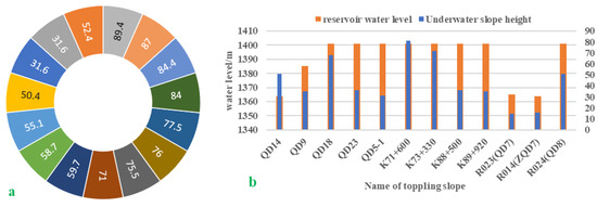 (a) Water depth on the front of the slope with toppling failure. (b) The relationship between the water depth in front of the slope and the quantity of toppling failure.