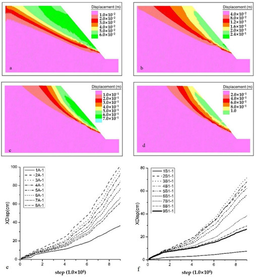 In order to analyze the mechanism of hydrodynamic force on the secondary failure of toppling deformation body, the discrete element numerical simulation method was used to simulate the deformation characteristics of toppling rock mass under the action of pore water pressure in different impoundment stages. In the numerical model, the vertical and horizontal permeability coefficients of different toppling types were used based on Formula (1). The total displacement of interbedded toppling slope without water storage and water storage at 30 m, 60 m and 80 m are shown in Figure 8a–d. Before water storage, the slope forms a deformation area with a maximum displacement of 60 mm in areas B1, B2 and C, and the overall deformation is small. The deformation mainly comes from the toppling–collapse and toppling–loose areas and the closed deformation of the rock layer and joint surface. With the rise of water level, the displacement of each area increases obviously, an obvious displacement differentiation zone is generated between area A and area B, and the differentiation surface is in a slip arc shape. At the same time, an obvious displacement differentiation zone is also formed between area B2 and area C. When the storage water level reaches 60 m, the deformation of each part of the rock mass in area A exceeds 1.00 m. The deformation gradient of in area B is obvious, finally reaching 20~80 cm. The maximum displacement in area C is less than 20 cm. Accelerated deformation occurs in area A after 10 m of water storage. The deformation of rock mass below 10 m increases slightly with the rise of water level, and the displacement of the slope top finally reaches 60~100 cm (Figure 8e). Area B2 and area C deform after 10 m of water level, and the displacement in X direction of area B finally reaches 15~50 cm (Figure 8f).