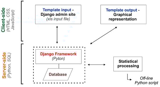 The structure of the code for the interactive SLONIP platform is based on Django [], i.e., a server-side web framework written in the programming language Python. Django represents the logical foundation of the code that serves as the platform’s backend (i.e., the server-side) and is capable of communicating with the frontend (i.e., the client-side). The platform’s frontend is the part of the code responsible for the graphical interface as seen by the web user. The backend takes care of the data displayed on the page. It makes sure it is safely stored in a database and that the data is readily available if instructed by the frontend (triggered by an action performed by a web user) and is where the statistical processing of the data is performed.