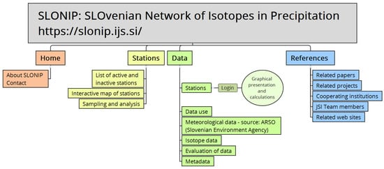 The idea of establishing the Slovenian Network of Isotopes of Precipitation (SLONIP) research platform following the GNIP model was presented for the first time in 2006 []. This initiative was followed by a lengthy transitional period, where various activities took place. Unfortunately, these were not unified at the national or inter-institute level []. Finally, in 2015, the infrastructure at the JSI was upgraded, which enabled the independent monitoring of water isotopes in precipitation at selected sites in Slovenia. Simultaneously, a need appeared to make the SLONIP platform publicly accessible and interactive. While part of the functionality of the SLONIP platform is related to that of GNIP (e.g., information on measurement stations along with monthly, annual, and long-term isotopic means and regression lines), SLONIP has added functionality enabling data processing and visualization (Section 3).