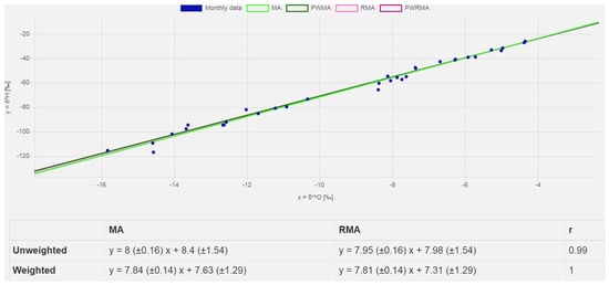 The snapshot of the scatter plot of δ2H versus δ18O including all monthly data (blue dots) and different LMWLs, i.e., precipitation-amount unweighted or weighted major axis (MA) or reduced major axis (RMA) regression lines for the Murska Sobota station data [].