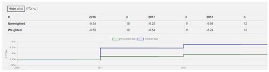 Finally, monthly, seasonal, and annual data are presented. The user can select different display options by clicking the “box” buttons Show/Hide data or plot. In addition, the user can compare the differences between the unweighted and precipitation amount weighted data. For example, δ18O annual means at Murska Sobota in 2016 show no significant difference between unweighted and weighted data, whereas differences are pronounced for 2017 and 2018 (Figure 5). The different δ18O annual means indicate the importance of not uniformly distributed precipitation, which changes monthly and annually.