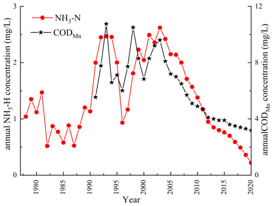 The annual concentration of NH3-N and CODMn during 1978–2020.