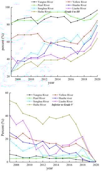 Figure 4 showed the changes of water quality in the major river basins during 2007–2020. During 2007 and 2020, the water quality in Yangtze River experienced an improvement–fluctuating changes–improvement pattern. The Yellow River, Pearl River. and Huaihe River have experienced improvement–deterioration–improvement changing patterns. The Songhua River, Haihe River and Liaohe River have showed fluctuating improvement. Since 2017, the water quality in the seven major river basins showed a rapid improvement, with an obvious increase for the ratio of grade I to III sections and a decreasing trend for the ratio of grade V sections.