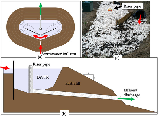 The P removal structure with spent lime DWTR, as depicted in (a) plan view, (b) cross section, and (c) actual photograph after construction.