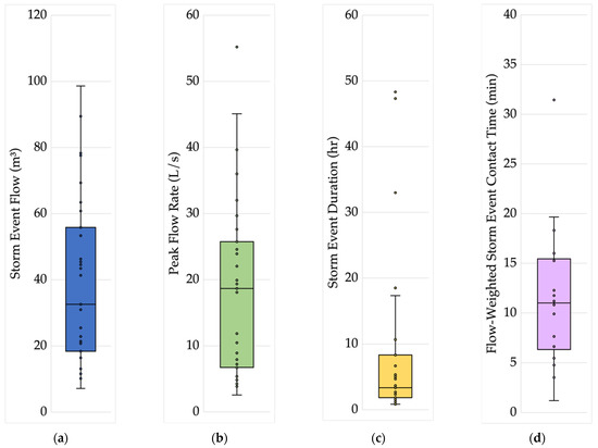 The median storm event flow was 32.6 m3, ranging from 7.2 to 98.6 m3 (Figure 2a). The inter-quartile range of peak flow rates recorded during storm events was between 6.7 and 25.7 L/s, but one storm recorded a peak 10-min discrete flow rate of 55.2 L/s (Figure 2b). Generally, most storm events were less than 8 h (Figure 2c), but in a few cases, storm event durations were 30 to 50 h. However, most of these long-duration storms were comprised of two flow peaks separated by little to no flow.