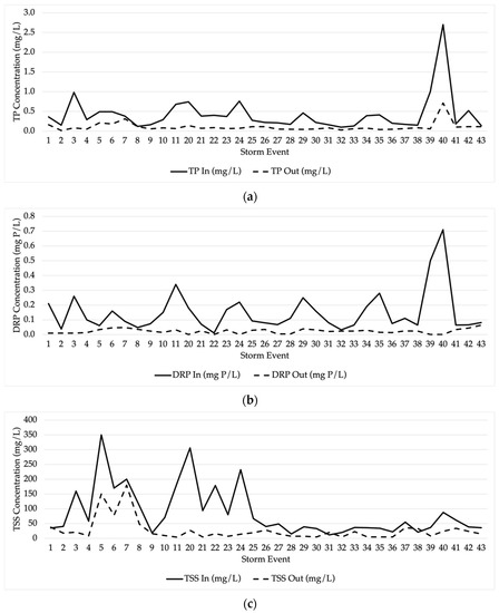 Event mean influent concentrations of TSS fluctuated between 12 and 350 mg/L (Figure 3c). Effluent from the P removal structure reduced TSS concentrations in 33 out of 35 storm events (94%) with an overall reduction of 58.8%, which was statistically significant.