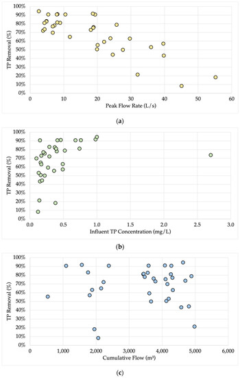 Event mean TP removal (%) plotted against (a) peak flow rate observed during storm event, (b) event mean TP concentration in stormwater, and (c) cumulative total of stormwater that flowed through the spent lime DWTR.